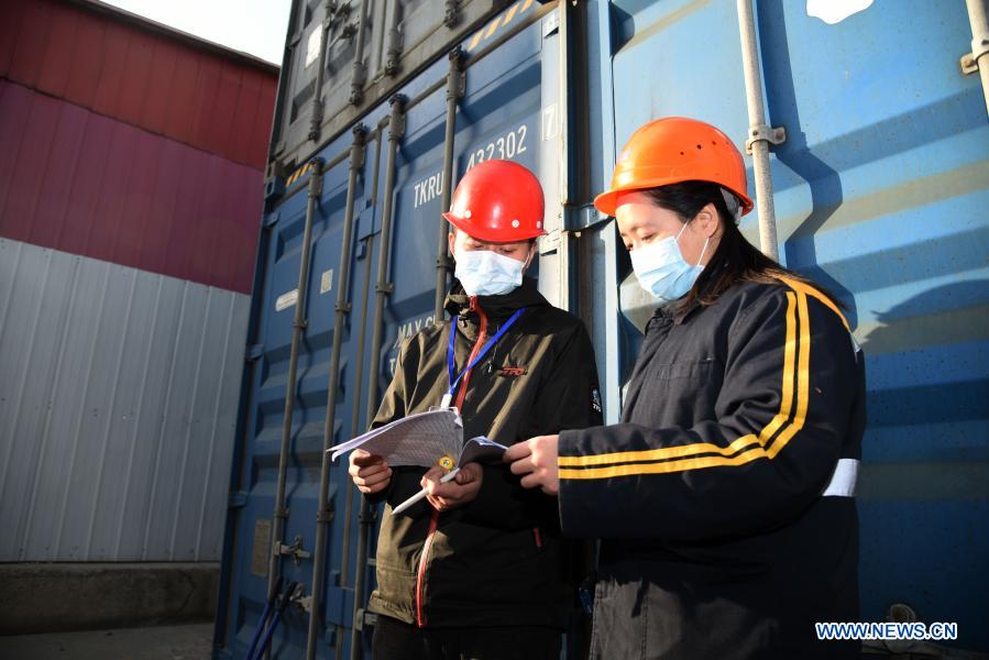 Staff members check on the cargo of a "Qilu" freight train heading to Budapest at a railway station in Jinan, east China's Shandong Province, Feb. 8, 2021. In January 2021, 118 trips of "Qilu" freight train were made, up 45.7 percent year on year. The value of exports and imports via the train services was about 1.3 billion yuan (201.5 million U.S. dollars), up 205.2 percent year on year, according to the service operator Shandong High-speed Group. (Xinhua/Wang Kai)