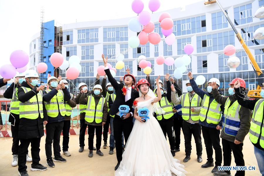 Jiang Jifeng and Zhang Xiaoju hold a wedding at a construction site in Hefei, east China's Anhui Province, Feb. 8, 2021. The 27-year-old Jiang Jifeng is a technician of China Construction Fifth Engineering Bureau. At the beginning of 2020, Jiang and his fiancee Zhang Xiaoju cancelled their wedding for the sake of the prevention and control of the COVID-19 epidemic. Jiang has been busy working on the construction site since the cancellation a year ago. The couple decided to hold their wedding on the construction site ahead of the Spring Festival, as they chose to stay put over the Spring Festival holiday to reduce the risk of COVID-19 infections during the travel rush. (Xinhua/Liu Junxi)
