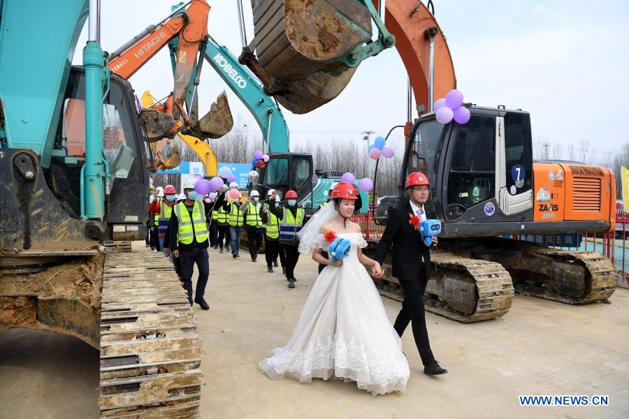 Jiang Jifeng and Zhang Xiaoju hold a wedding at a construction site in Hefei, east China's Anhui Province, Feb. 8, 2021. The 27-year-old Jiang Jifeng is a technician of China Construction Fifth Engineering Bureau. At the beginning of 2020, Jiang and his fiancee Zhang Xiaoju cancelled their wedding for the sake of the prevention and control of the COVID-19 epidemic. Jiang has been busy working on the construction site since the cancellation a year ago. The couple decided to hold their wedding on the construction site ahead of the Spring Festival, as they chose to stay put over the Spring Festival holiday to reduce the risk of COVID-19 infections during the travel rush. (Xinhua/Liu Junxi)