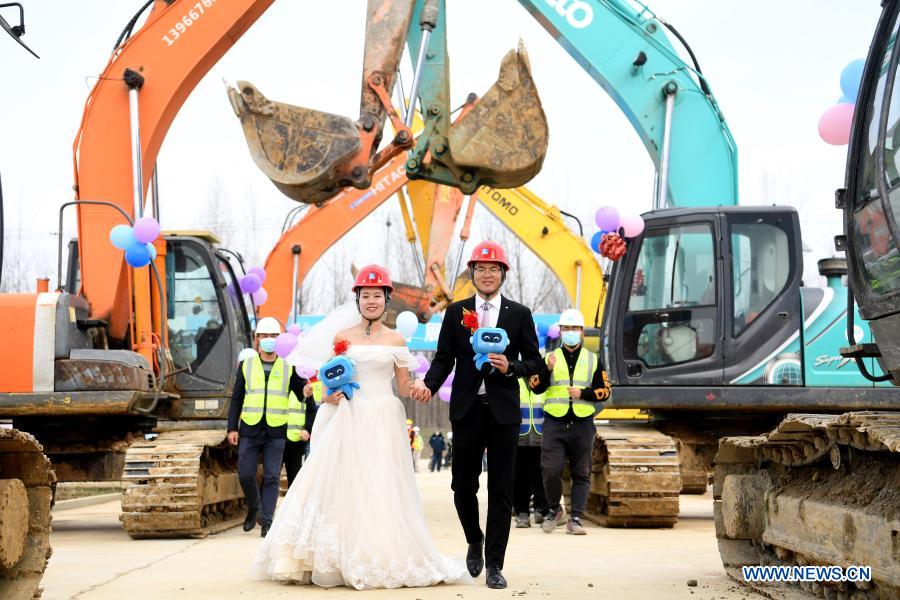 Jiang Jifeng and Zhang Xiaoju hold a wedding at a construction site in Hefei, east China's Anhui Province, Feb. 8, 2021. The 27-year-old Jiang Jifeng is a technician of China Construction Fifth Engineering Bureau. At the beginning of 2020, Jiang and his fiancee Zhang Xiaoju cancelled their wedding for the sake of the prevention and control of the COVID-19 epidemic. Jiang has been busy working on the construction site since the cancellation a year ago. The couple decided to hold their wedding on the construction site ahead of the Spring Festival, as they chose to stay put over the Spring Festival holiday to reduce the risk of COVID-19 infections during the travel rush. (Xinhua/Liu Junxi)