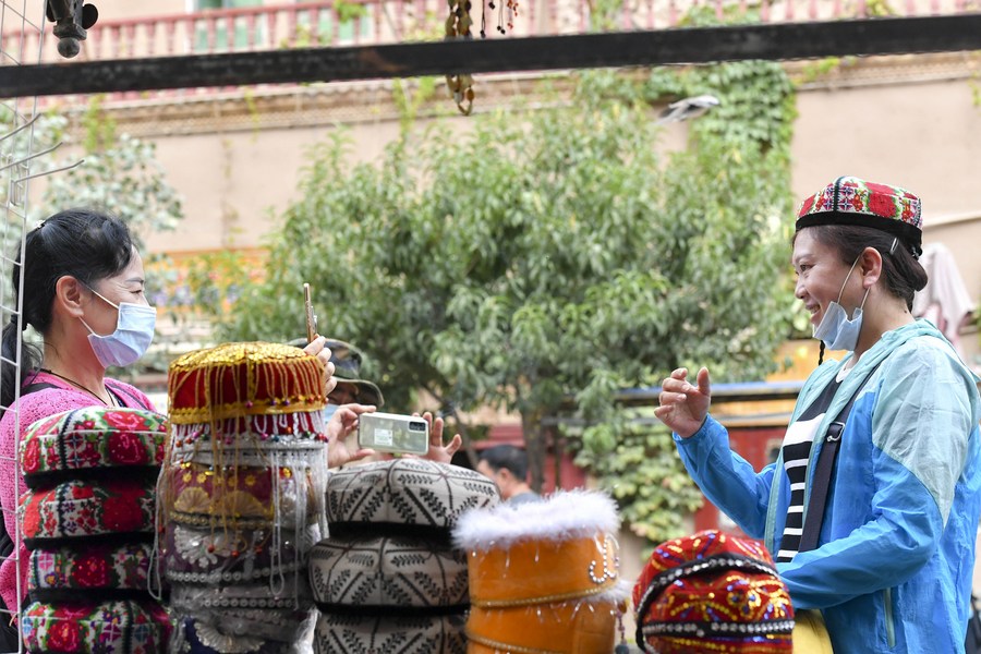 Visitors select hats in the ancient city of Kashgar, northwest China's Xinjiang Uygur Autonomous Region, Sept. 11, 2020. Xinjiang's economy expanded 3.4 percent year on year in 2020, 1.1 percentage points higher than the national GDP growth, according to the local government work report delivered to the annual session of the regional legislature. (Xinhua/Ma Kai)