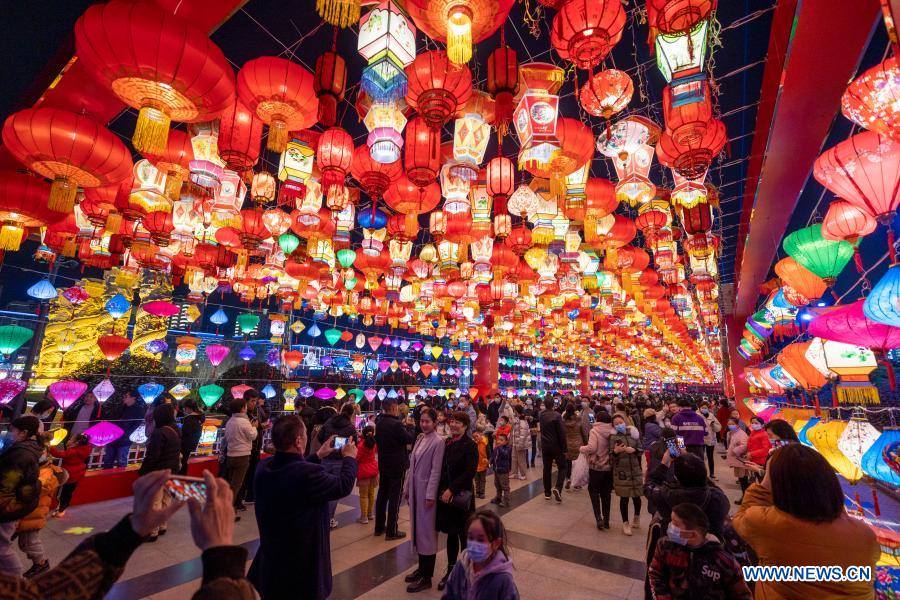 Citizens view lanterns ahead of the Spring Festival at Nanfeng Square in Yuncheng City, north China's Shanxi Province, Feb. 7, 2021. (Photo by Yan Xin/Xinhua)