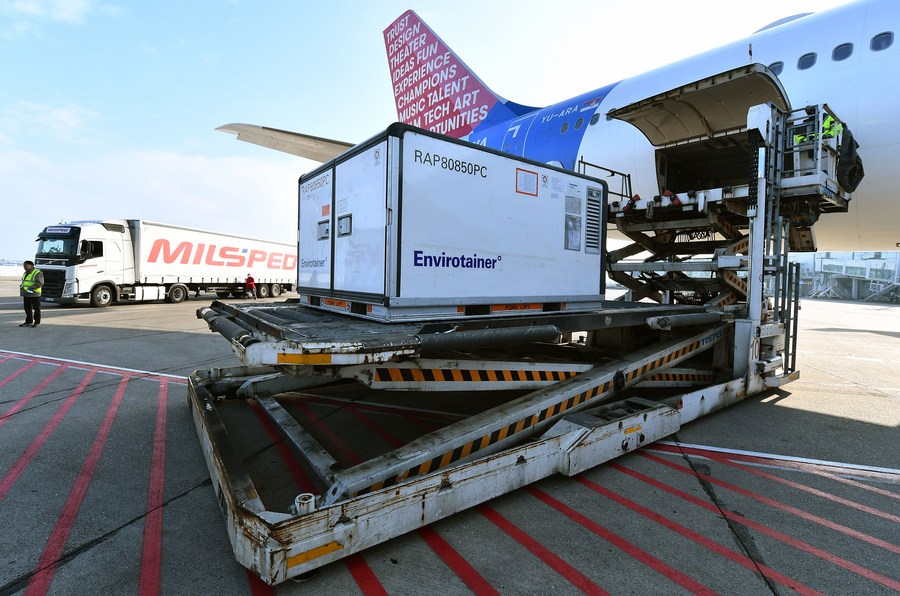 Workers unload a container of China's Sinopharm inactivated coronavirus vaccines at the Belgrade Airport, Serbia, Jan. 16, 2021. (Photo by Predrag Milosavljevic/Xinhua)