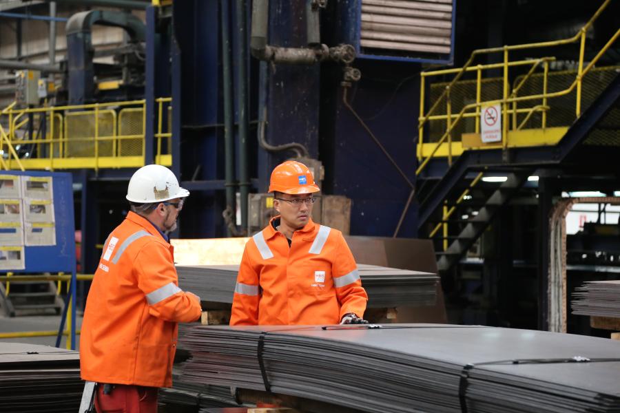 A Serbian worker (L) discusses with a Chinese engineer at the Chinese-invested HBIS Group Serbia Iron & Steel in Smederevo, Serbia, Oct. 10, 2019.(Xinhua/Shi Zhongyu)