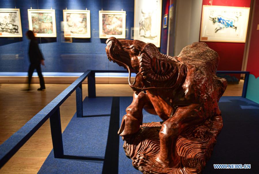 Photo taken on Feb. 9, 2021 shows the exhibits at an ox-themed art exhibition welcoming the Year of the Ox at Hainan Museum in Haikou, south China's Hainan Province. (Xinhua/Pu Xiaoxu)