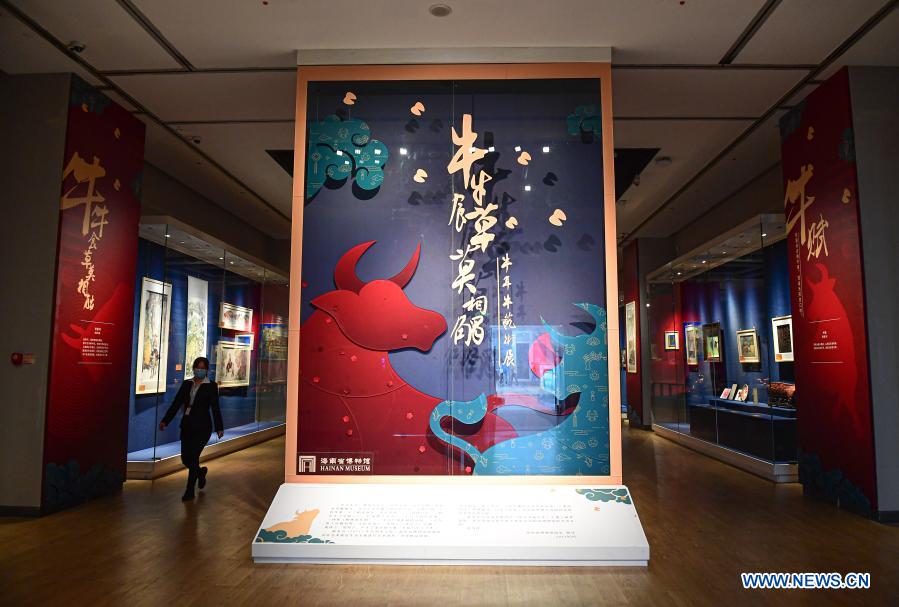 Photo taken on Feb. 9, 2021 shows the exhibits at an ox-themed art exhibition welcoming the Year of the Ox at Hainan Museum in Haikou, south China's Hainan Province. (Xinhua/Pu Xiaoxu)
