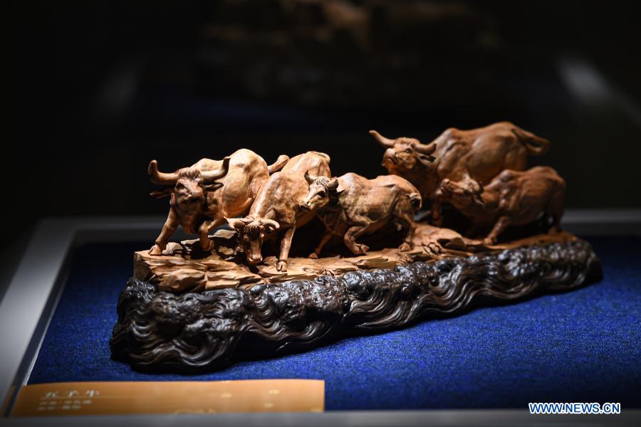 Photo taken on Feb. 9, 2021 shows an exhibit at an ox-themed art exhibition welcoming the Year of the Ox at Hainan Museum in Haikou, south China's Hainan Province. (Xinhua/Pu Xiaoxu)
