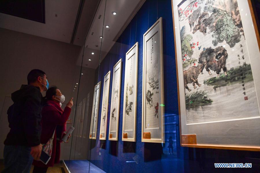 People visit an ox-themed art exhibition welcoming the Year of the Ox at Hainan Museum in Haikou, south China's Hainan Province, Feb. 9, 2021. (Xinhua/Pu Xiaoxu)
