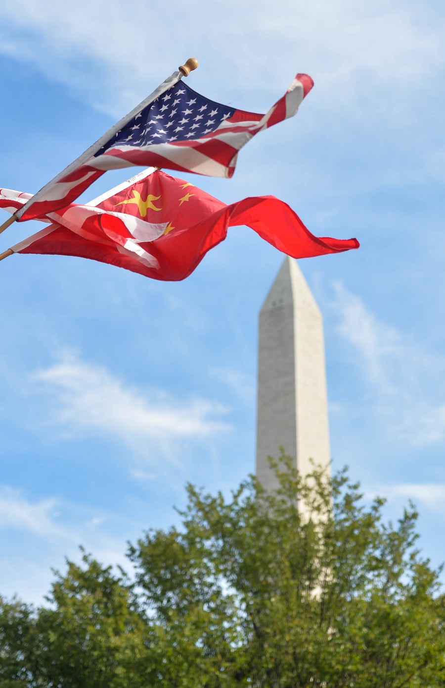 Photo taken on Sept. 24, 2015 shows the national flags of China (bottom) and the United States as well as the flag of Washington, D.C. on the Constitution Avenue in Washington, D.C., the United States. (Xinhua/Bao Dandan)