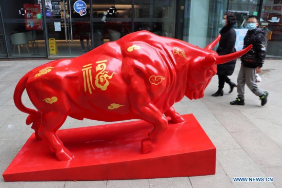 People walk past an ox sculpture set as decorations for the upcoming Chinese Lunar New Year in Changzhou City, east China's Jiangsu province, Feb. 10, 2021. (Photo by Wang Qiming/Xinhua)