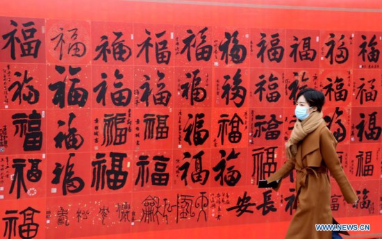 A woman walks past an exhibition poster of the Chinese character "Fu," meaning blessings, for the upcoming Chinese Lunar New Year in Changzhou City, east China's Jiangsu province, Feb. 10, 2021. (Photo by Wang Qiming/Xinhua)