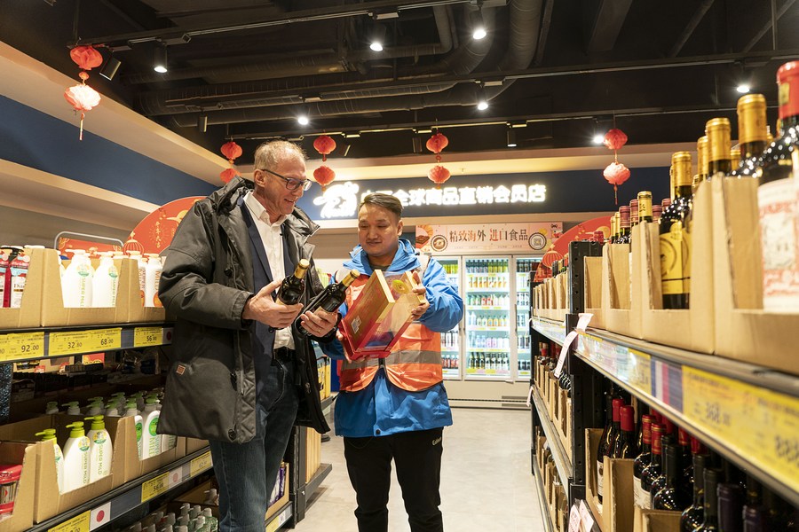 Wuhan local Zhong Weiwei (R) helps French doctor Philippe Klein shop for the Spring Festival in Wuhan, central China's Hubei Province, Feb. 3, 2021. (Xinhua/Xiong Qi)