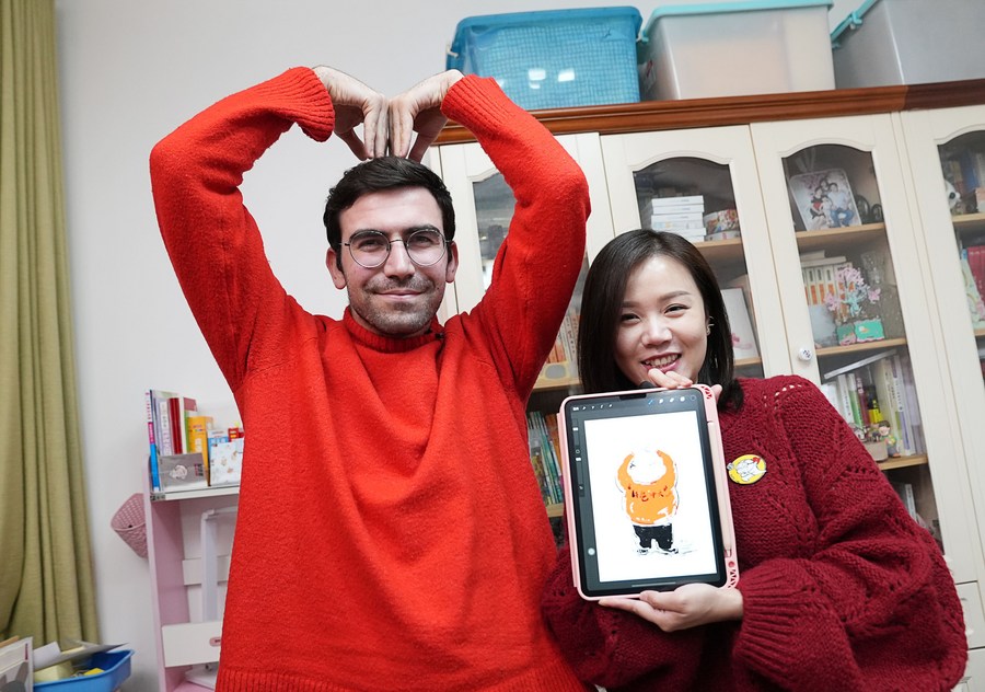 Li Jing (front), an illustrator in Wuhan, creates illustrations with Israeli blogger and entrepreneur Raz Galor in Wuhan, central China's Hubei Province, Feb. 6, 2021. (Xinhua/Xiong Qi)