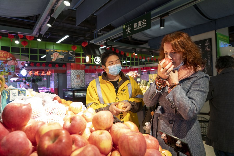 Peng Zilong (L), a 30-year-old deliveryman, shops with Italian professor Sara Platto for the Spring Festival in Wuhan, central China's Hubei Province, Feb. 2, 2021. (Xinhua/Xiong Qi)