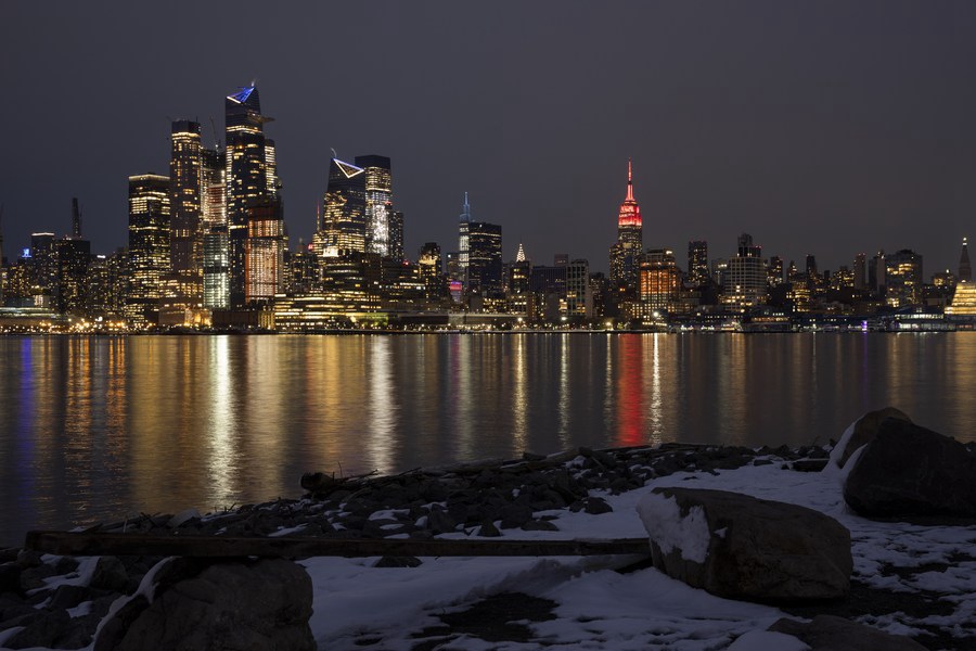Photo taken on Feb. 10, 2021 shows the Empire State Building lit up in red for the Chinese Lunar New Year, in New York, the United States. (Xinhua/Wang Ying)