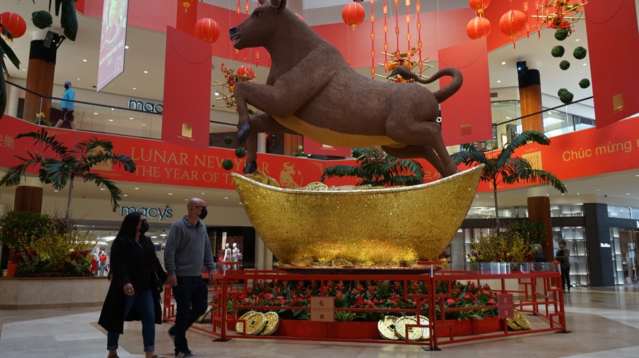 Visitors pass by an ox-themed decoration in South Coast Plaza, Orange County of California, the United States, Feb. 11, 2021. (Photo by Zeng Hui/Xinhua)