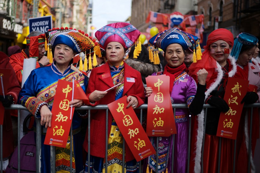 People attend the Chinese Lunar New Year parade in Manhattan's Chinatown of New York City, the United States, Feb. 9, 2020. (Xinhua/Li Muzi)
