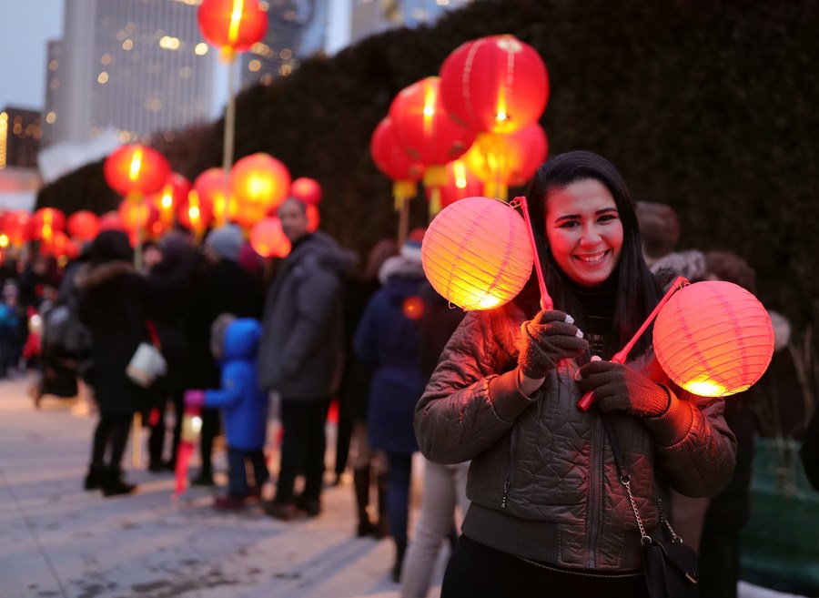 People participate in a lantern procession to celebrate Chinese Lunar New Year in Chicago, the United States, on Feb. 8, 2020. (Xinhua/Wang Ping)