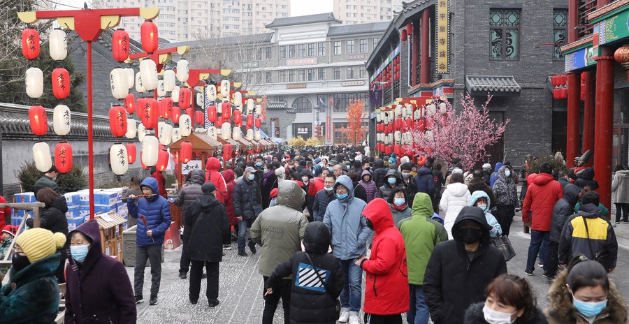 People visit the Old North Market during the Lunar New Year holiday in Shenyang, northeast China's Liaoning Province, Feb. 14, 2021. (Xinhua/Yang Qing)