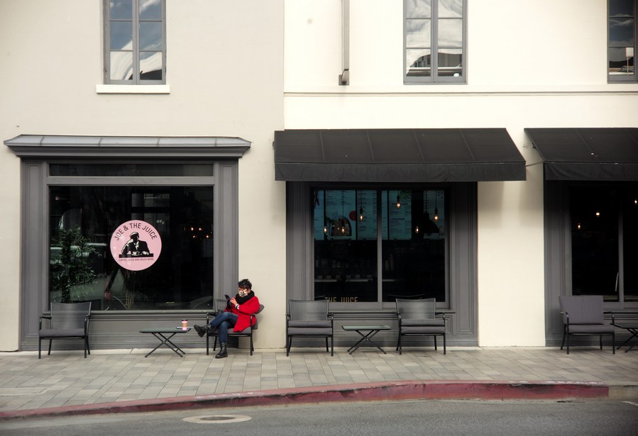 A woman sits outside a coffee shop on a business street in Burlingame, California, the United States, Feb. 16, 2021. (Xinhua/Wu Xiaoling)