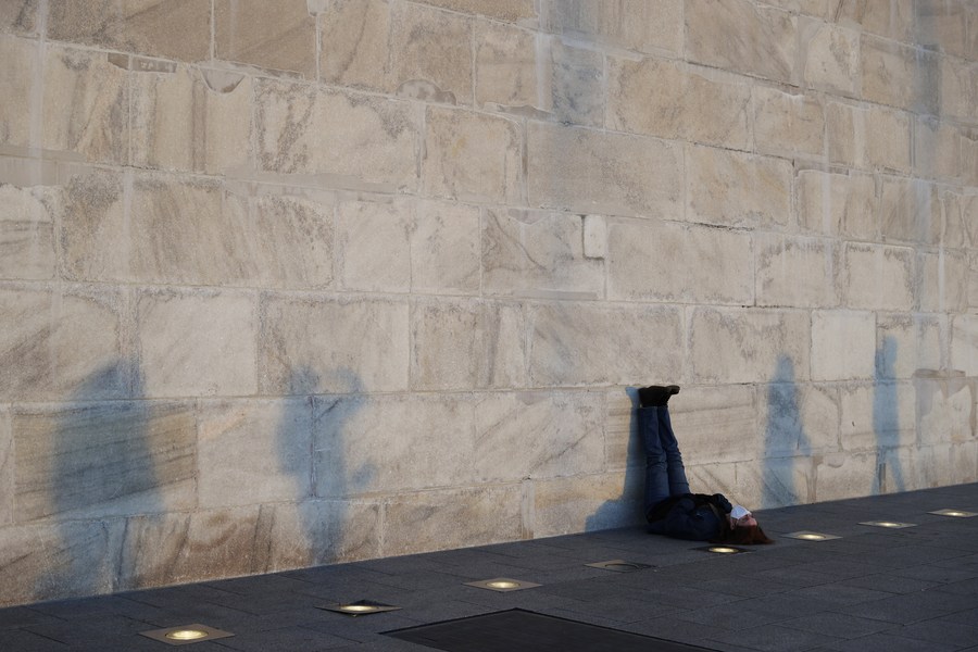 A woman wearing a mask looks at the Washington Monument in Washington, D.C., the United States, Jan. 30, 2021. (Photo by Ting Shen/Xinhua)