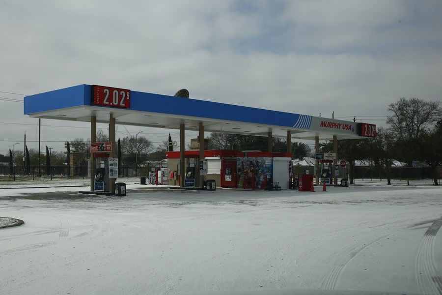 A gas station is closed due to power outage in Houston, Texas, the United States, on Feb. 15, 2021. (Photo by Chengyue Lao/Xinhua)