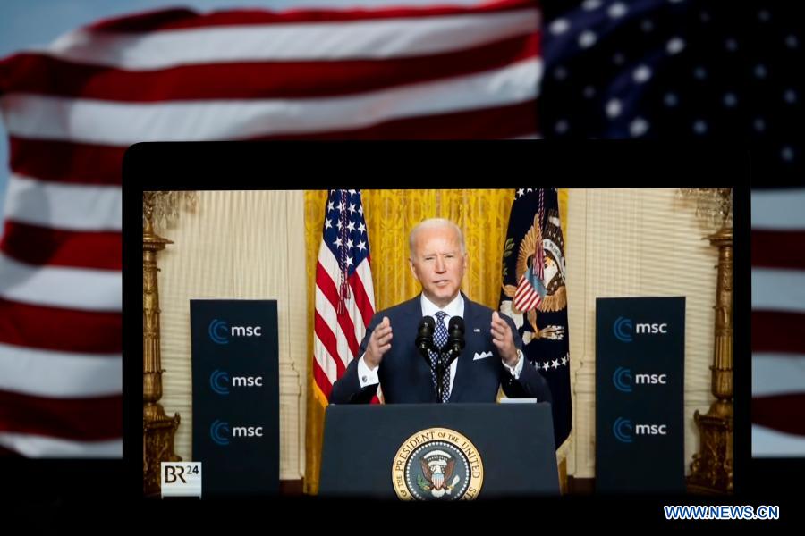 Photo taken in Arlington, Virginia, the United States, on Feb. 19, 2021 shows a screen displaying U.S. President Joe Biden speaking in Washington, D.C. during a virtual event with the Munich Security Conference in a video provided by the U.S. State Department. Biden said on Friday that the United States is returning to the transatlantic partnership and will address global challenges like climate change and the COVID-19 pandemic. (Xinhua/Liu Jie)