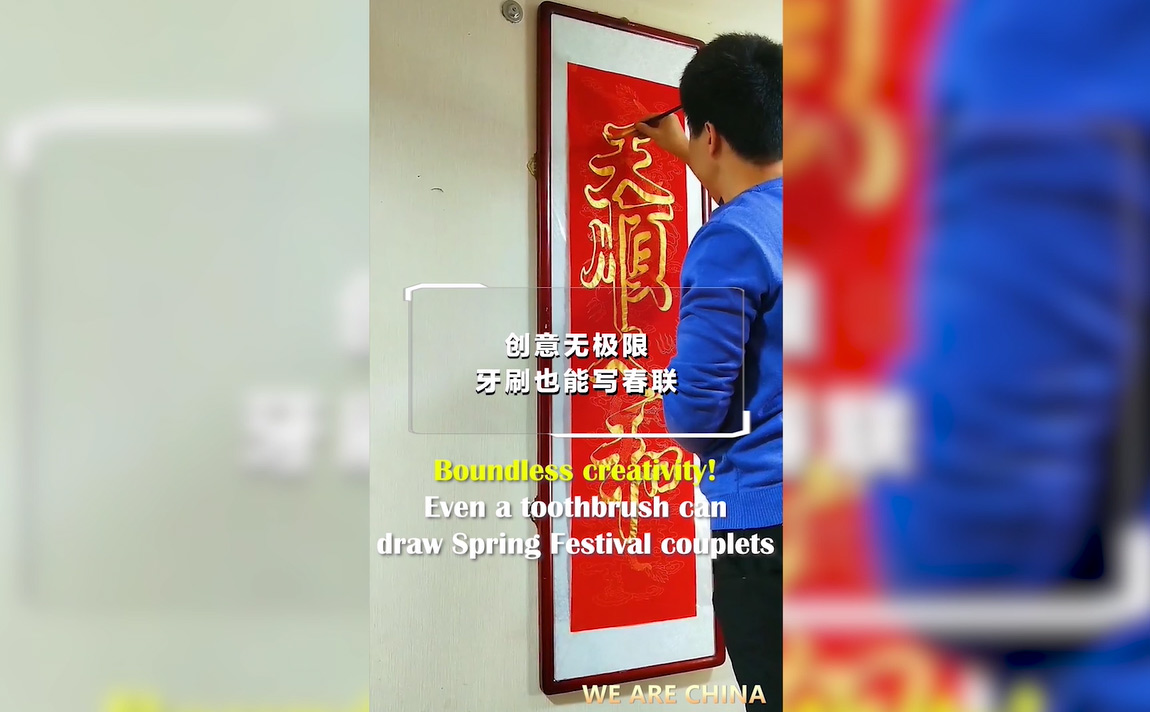 When people start pasting Spring Festival couplets and the Chinese character "Fu" on their doorways, it means that the Spring Festival is fast approaching. Are you getting tired of all those mass-printed paper couplets? Come and see how other people are drawing their own fanciful Spring Festival couplets. A good drawer needs not choose his pen, since even a toothbrush can be used to draw couplets. Gloves dipped in thick black ink, even the thumb is no less inferior to the brush. When writing calligraphy with sand, it is important to visualize the strokes in your mind. A huge handwritten "Fu" can represent a New Year's blessing in one stroke. Let's all get creative and write our own Spring Festival couplets!