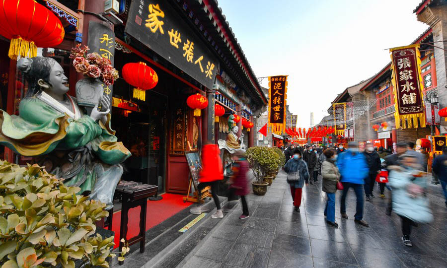 People visit an ancient cultural street in Tianjin, north China, Feb. 17, 2021, the last day of this year's Spring Festival holiday. (Photo by Sun Fanyue/Xinhua)