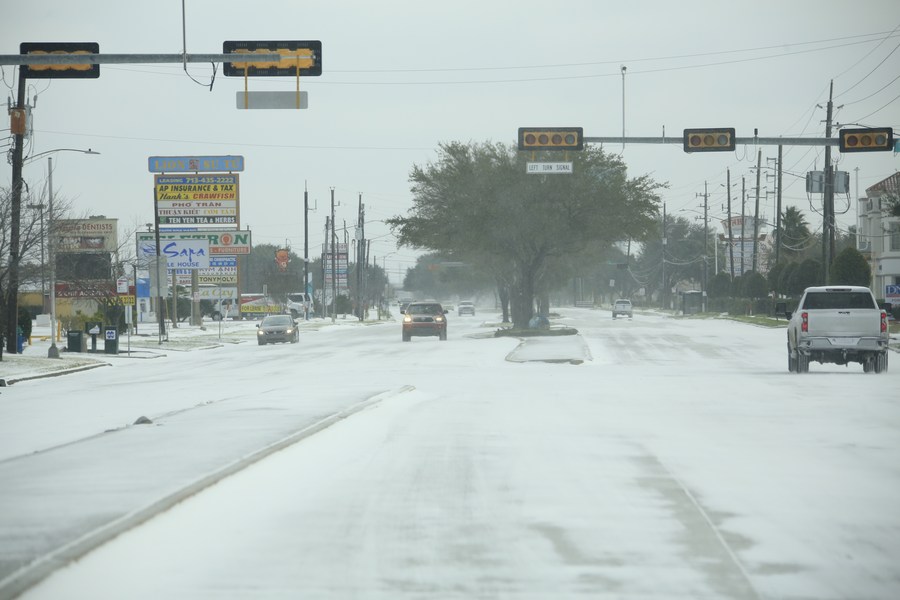 Vehicles move on a snow-capped road in Houston, Texas, the United States, on Feb. 15, 2021. (Photo by Chengyue Lao/Xinhua)