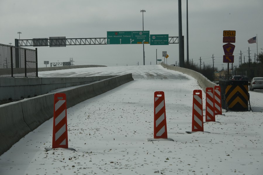 The on-ramp to a highway is closed due to snow and ice in Houston, Texas, the United States, on Feb. 15, 2021. (Photo by Chengyue Lao/Xinhua)