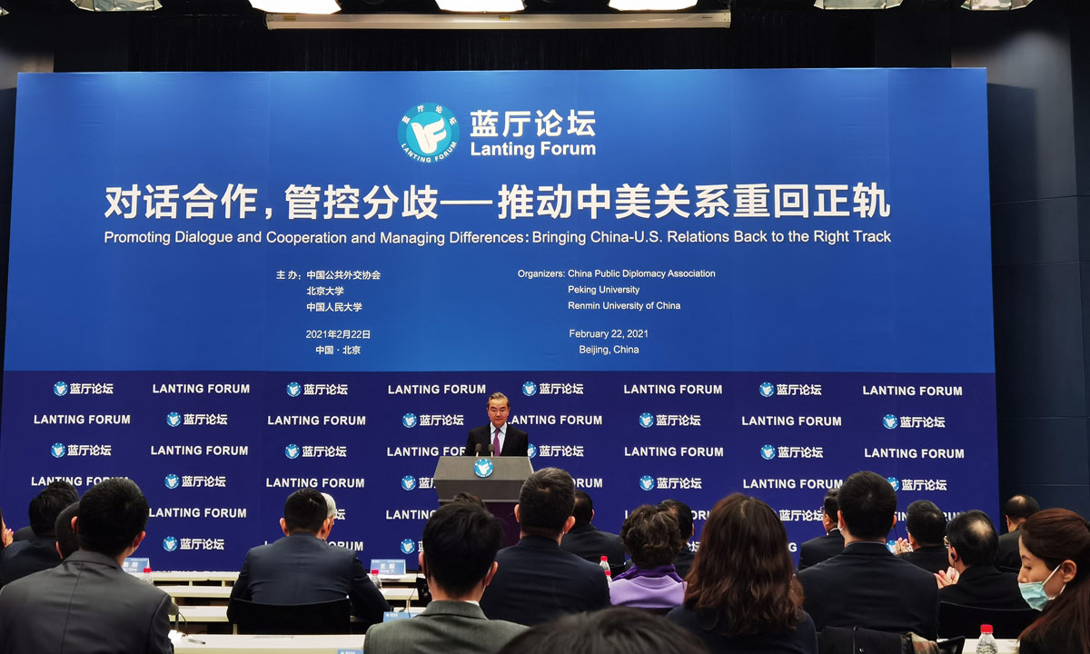 Wang made the remarks when delivering a speech at the opening of the Lanting Forum in Beijing, with the theme of "Promoting Dialogue and Cooperation and Managing Differences: Bringing China-U.S. Relations Back to the Right Track."