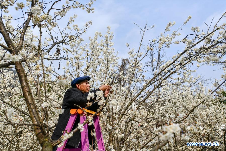Li Xigao of Miao ethinic group trims cherry trees in Huawu Village, Qianxi County of Bijie City, southwest China's Guizhou Province, Feb. 20, 2021. Located in the deep mountainous area of Xinren Miao Township of Guizhou, Huawu Village is famous for its amazing landscapes. In recent years, with the efforts of local government, the village develops planting, cultivation, and tourism while relocating poverty-stricken people. Nowadays Huawu has taken on a new look in the new year, with various industries greeting booming development. (Xinhua/Yang Wenbin)
