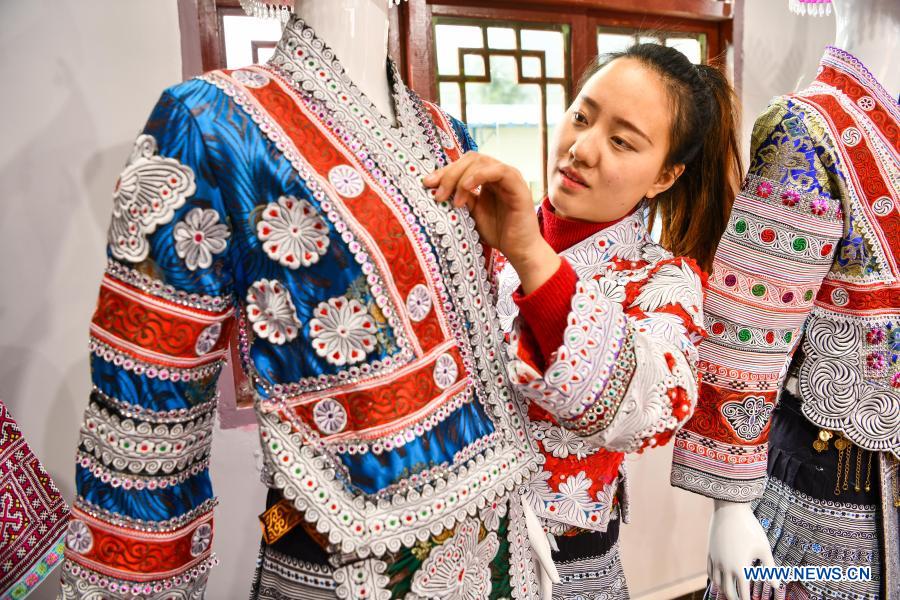 Yang Wenli of Miao ethnic group arranges Miao costumes at the relocation site for poverty-stricken people in Huawu Village, Qianxi County of Bijie City, southwest China's Guizhou Province, Feb. 20, 2021. Located in the deep mountainous area of Xinren Miao Township of Guizhou, Huawu Village is famous for its amazing landscapes. In recent years, with the efforts of local government, the village develops planting, cultivation, and tourism while relocating poverty-stricken people. Nowadays Huawu has taken on a new look in the new year, with various industries greeting booming development. (Xinhua/Yang Wenbin)