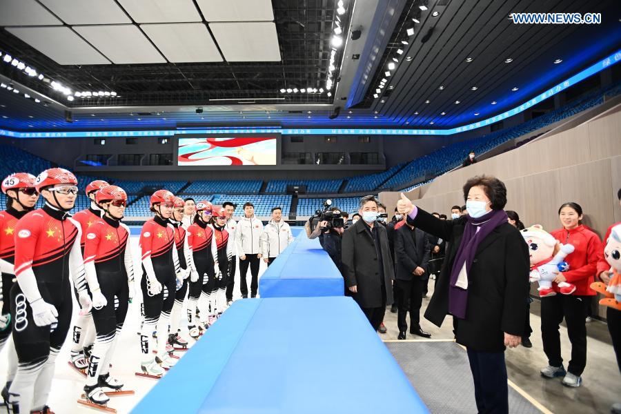 Chinese Vice Premier Sun Chunlan, also a member of the Political Bureau of the Communist Party of China Central Committee, inspects the Capital Gymnasium in Beijing, capital of China, Feb. 22, 2021. Sun on Monday visited the Capital Gymnasium in the capital city's Haidian District, the National Alpine Skiing Center, and the National Sliding Center in Yanqing District. She inspected the venues' construction and athletes' preparations, extended her thanks to the athletes, coaches, and working staff for preparing the Games, and expressed her best wishes for the Chinese Lunar New Year. Sun urged Chinese athletes to work harder to improve competition skills, make more efforts for better results, display outstanding morals, win glory for the motherland, and add luster to their lives. (Xinhua/Li Xiang)