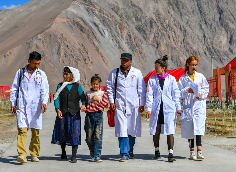 Doctors are seen on their way to provide diagnosis and treatment at the resettlement community for relocated residents of Rasekam Village in Taxkorgan Tajik Autonomous County, northwest China's Xinjiang Uygur Autonomous Region, July 7, 2019. (Xinhua/Wang Fei)