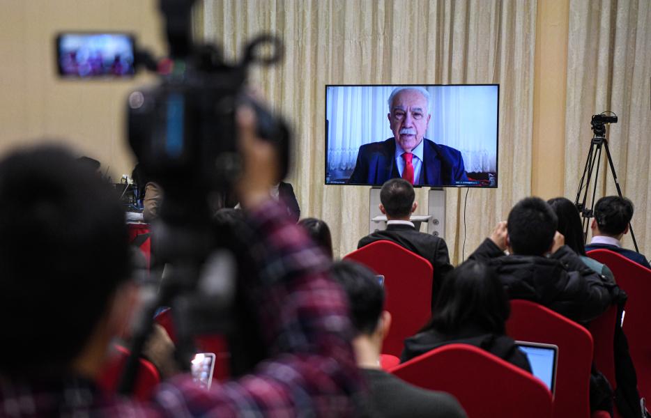 Dogu Perincek (on the screen), chairman of the Patriotic Party of Turkey, receives an online interview on the sidelines of an online briefing on the development of Xinjiang, Feb. 21, 2021. (Xinhua/Wang Fei)
