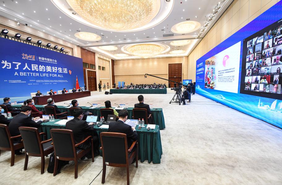 Photo taken on Feb. 22, 2021, shows the scene of an online briefing on the development of Xinjiang. (Xinhua/Wang Fei)