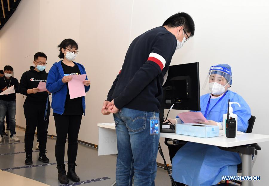 A medical worker (1st R) inputs personal information of the staff members at a temporary COVID-19 vaccination site at a company in the ZPark Phase 2 in Haidian District of Beijing, capital of China, Feb. 22, 2021. It is expected to take two days to complete the vaccination of more than 3,800 employees of the enterprise. (Xinhua/Ren Chao)
