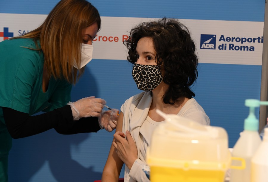 A medical worker receives the COVID-19 vaccine at a vaccination center at Rome's Fiumicino Airport, Italy, on Feb. 11, 2021. (Photo by Alberto Lingria/Xinhua)