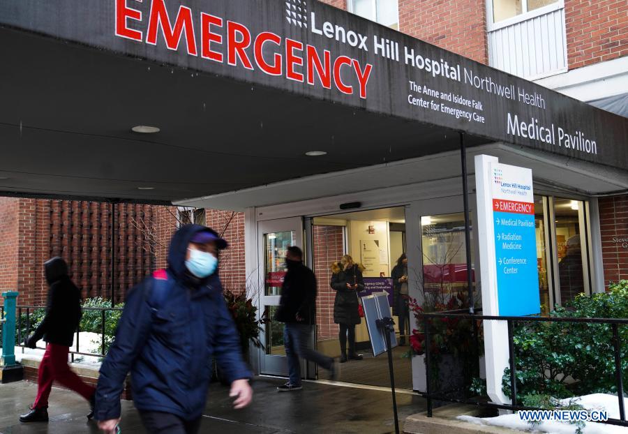People walk out from the emergency of a hospital in New York, the United States, Feb. 22, 2021. The United States reached the grim milestone of half a million coronavirus deaths on Monday, according to the Center for Systems Science and Engineering (CSSE) at Johns Hopkins University. (Xinhua/Wang Ying)