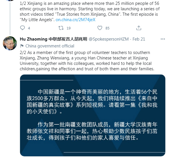 A screenshot of Hu Zhaoming's Twitter post on February 21 about the short video series. /@SpokespersonHZM