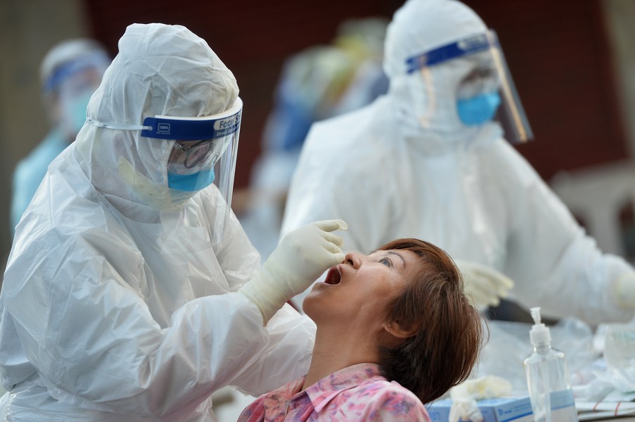 A health worker collects a swab from a woman for a COVID-19 test in Samut Sakhon province, Thailand, on Dec. 22, 2020. (Xinhua/Rachen Sageamsak)