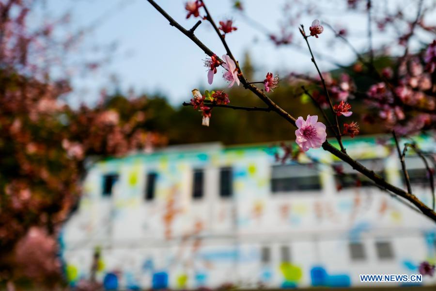 A monorail train runs past blooming flowers at Fotuguan section of Chongqing metro line 2 in southwest China's Chongqing Municipality, Feb. 23, 2021. (Xinhua/Liu Chan)