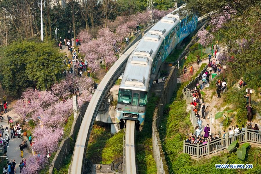 A monorail train runs past blooming flowers at Fotuguan section of Chongqing metro line 2 in southwest China's Chongqing Municipality, Feb. 23, 2021. (Xinhua/Liu Chan)