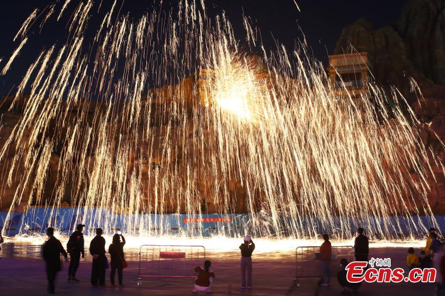 A molten iron fireworks show is performed at Nanchang Maya paradise in Jiangxi, Feb. 23, 2021, to greet the upcoming Lantern Festival which falls on the 15th day of the first lunar month. One of China's intangible cultural heritages, the show has attracted lots of tourists. (Photo: China News Service/Liu Zhankun)