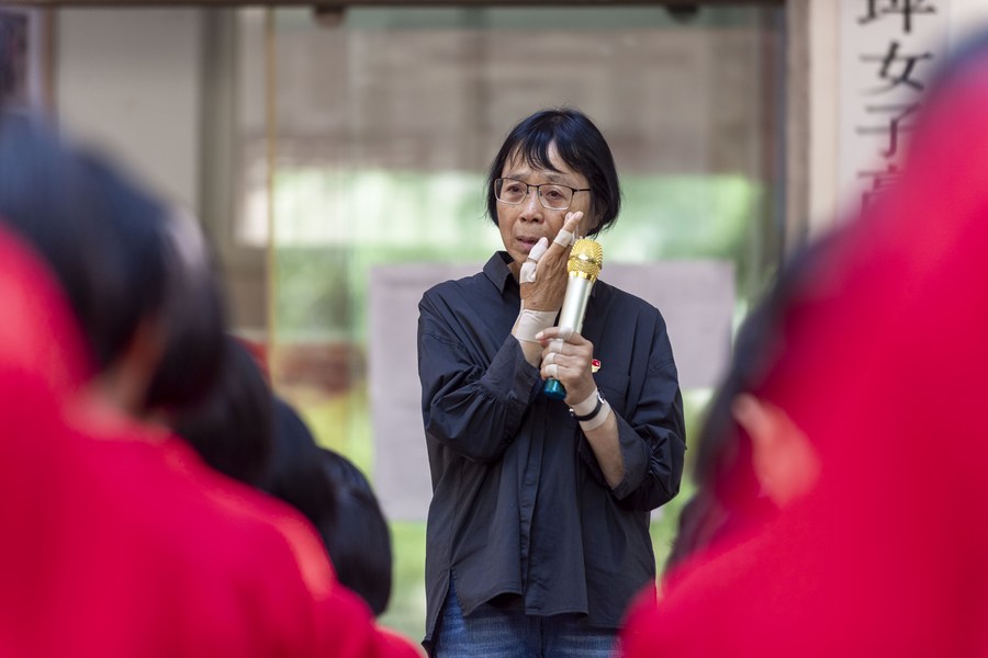 Zhang Guimei weeps during a lecture at the Huaping Senior High School for Girls in Lijiang, southwest China's Yunnan Province, Sept. 5, 2020. Zhang is the principal of the Huaping Senior High School for Girls, the country's first public high school that provides free education for female students, in the city of Lijiang. Zhang has been educating and aiding students in need, most living in isolated and poor areas. The school, led by Zhang, has created a miracle for the girls: 1,804 graduates have been admitted to colleges. (Xinhua/Chen Xinbo)