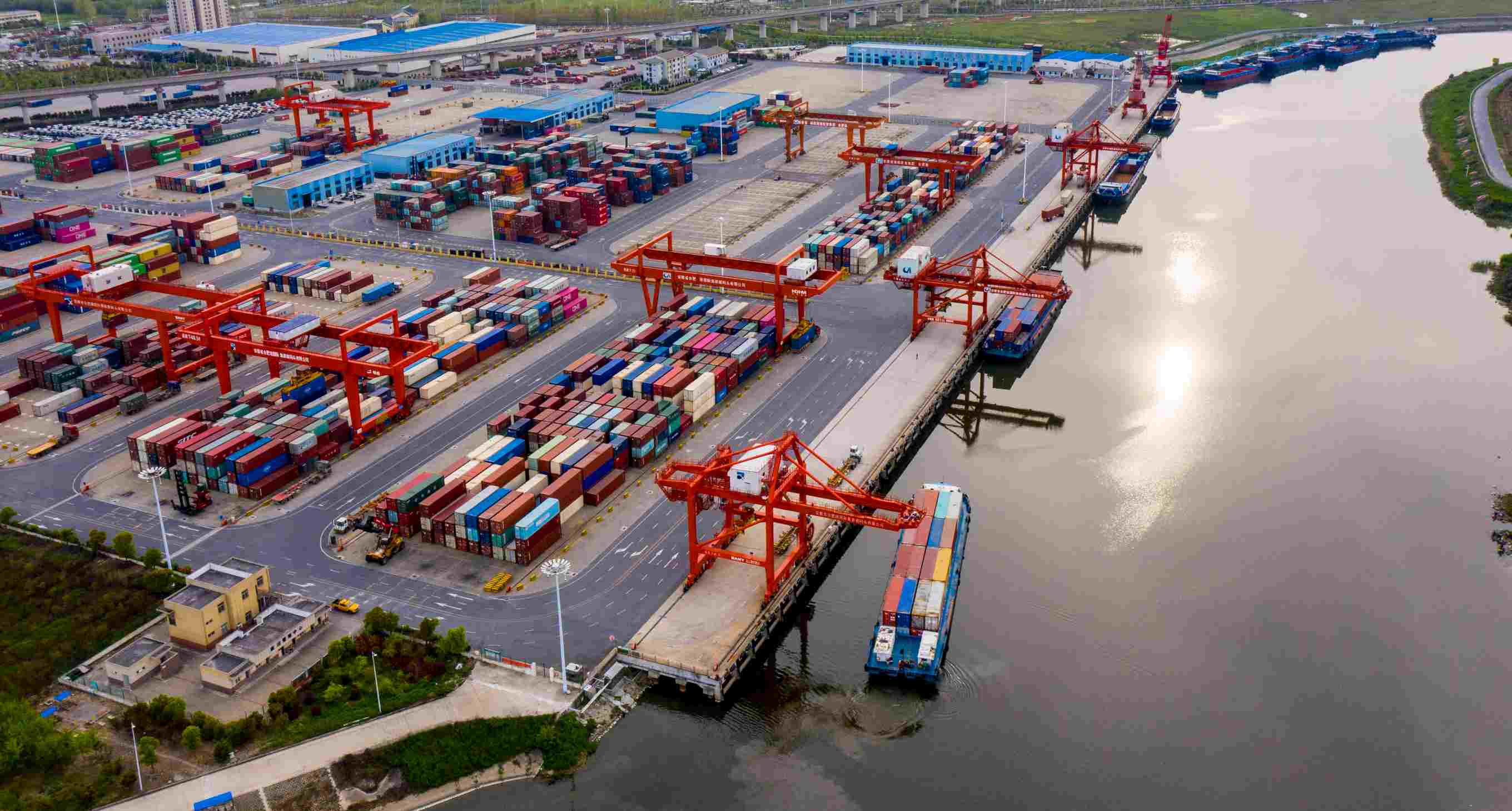 Aerial photo taken on Feb. 21, 2021 shows the International Container Terminal of Hefei Port in Hefei, east China's Anhui Province. (Xinhua/Cao Li)