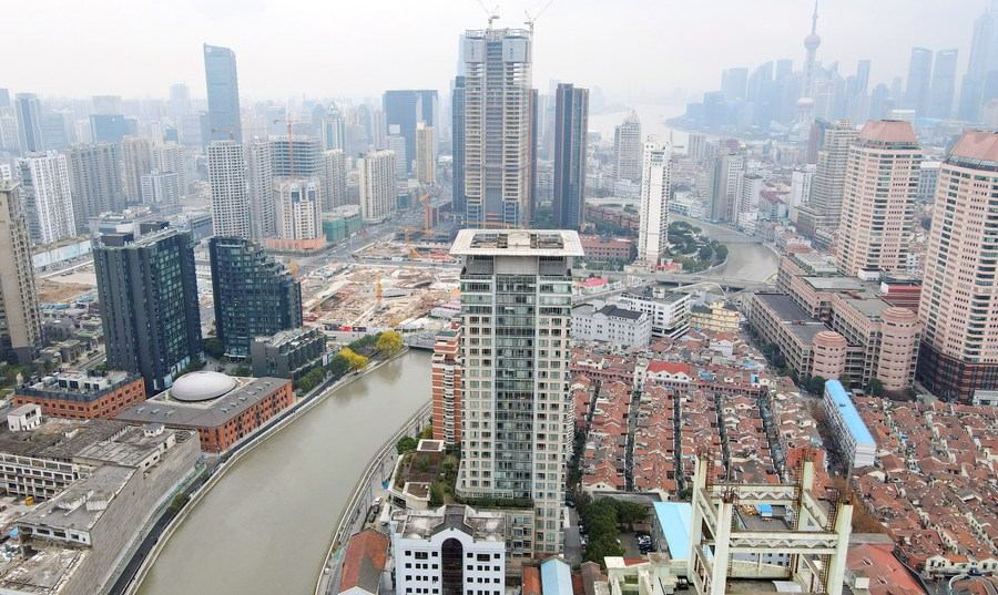 Aerial photo taken on Dec. 29, 2020 shows a view along the Suzhou River in Shanghai, east China. (Xinhua/Fang Zhe)