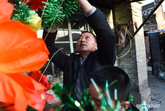 Hao Laixi's son Hao Yongjun prepares stage properties for the Ekou Naoge performance in Haojie Village of Daixian County, north China's Shanxi Province, Feb. 22, 2021. 73-year-old Hao is an inheritor of the national intangible cultural heritage Ekou Naoge performance, an art form integrating dancing, music, art with acrobatics. It is a local tradition to perform Ekou Naoge during the celebration of the Lantern Festival. This year, Hao decided to present an online performance for the festival at the suggestion of his son and grandson. (Xinhua/Chai Ting)